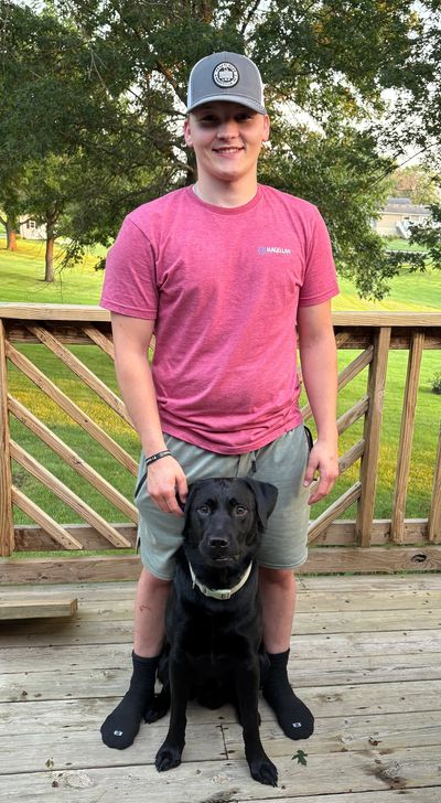 I was out at our farm squirrel hunting and of course, Cor was by my side and he started acting odd, jumping at me and trying to get my attention. I felt fine so I didn’t take the time to look at my Dexcom and I had silenced it because I was hunting. I just kept walking deeper into the woods looking for squirrels. Cor continued to jump at me and on me and then the low blood sugar symptoms started. I finally sat down and checked my Dexcom and I was 62, Cor sensed this and began alerting way before I dropped low but I didn’t pay attention, I told him I was fixing it and we shared some snacks and all was well but I don’t know what would have happened if I wouldn’t have had Cor with me that day. I named Cor after my best friend who died in a work accident, I miss that guy every day but I know he watches over me and I couldn’t think of a more fitting name for my new best friend.